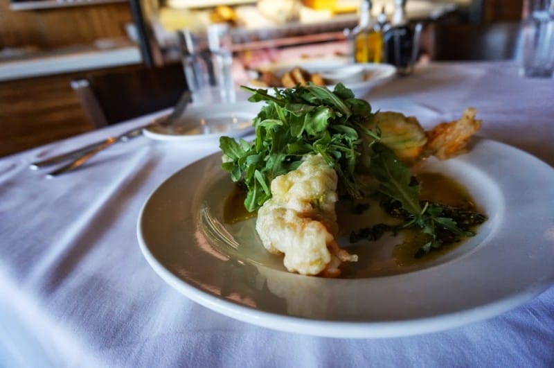 Fried zucchini squash blossoms filled with ricotta. Served with arugula and a light pesto. I like arugula for its sharp, peppery taste. It marries wonderfully with the light ricotta and ties in well with the pesto, bringing a fresh quality.