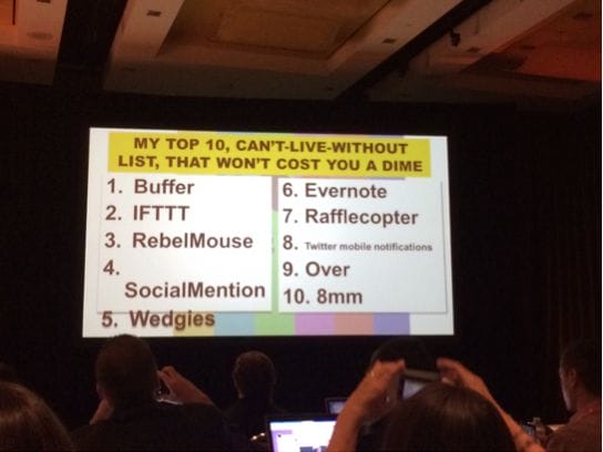 And Day 1 hit the ground running. Fantastic speakers such as Paula Berg and Sarah Evans stole the stage, with Paula Berg encouraging attendees to go against the status quo of social media marketing rules and to do what is best for your brand and your brand only. Evans shared with us her social media tool kit filled with recommendations for organizing photos, video, automation of web content, her “Top 10, Can’t-Live-Without List, That Won’t Cost You A Dime”, as all attendees excitedly pulled out their phones to take a photo of the screen (see below).