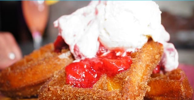 Originally from the East Coast, Chef Brad called The Pink Lady his “breakfast ode to the Ocean City Maryland Funnel Cake.” As an East Coaster myself, I could appreciate this description. However, Brad doesn’t give himself enough credit. This dish is much tastier and way more fun to eat than a boardwalk funnel cake. OCMD should call Brad and ask for some tips. The Pink Lady includes vanilla bean ice cream served over hot sugar and cinnamon fried waffles with strawberry sauce and cream. It is a decadent and delicious excuse to get out of bed on a Sunday.